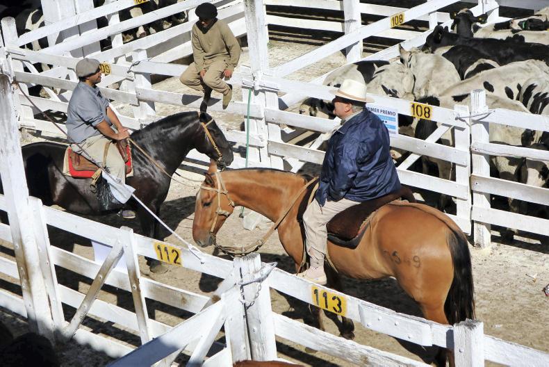 All cattle drovers are on horseback and the market is extremely efficient in moving stock and selling them. With the auctioneer moving on an improvised golf buggy through the pens and buyers standing on platforms above the cattle, it took 1 hour 35 mins to sell 3,700 cattle in Liniers market last Thursday.