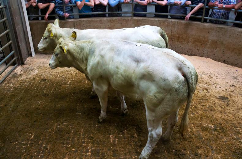 This pair of Charolais-cross bullocks, born September/December 2017 and weighing 488kg on average, sold for €880 each (€1.80/kg).