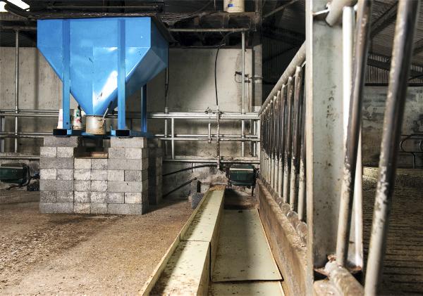 His main meal storage bin is outside but he has made a smaller bin that is easily transported into the shed on a forklift where it sits elevated at the end of the passageway. He brings his heifers into the slatted shed in summer to feed meals. The problem of them scattering the nuts across the passageway was overcome with a homemade lightweight trough, easily removed in winter. He had just “crow proofed” the shed after several frustrating efforts.