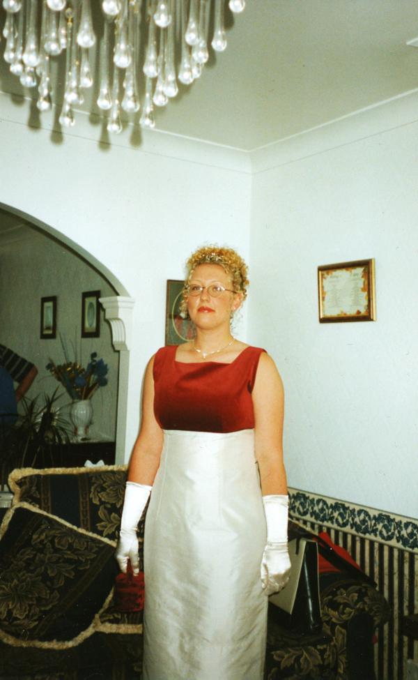 I really loved my debs dress. I paid for it myself out of wages I earned painting a pebble-dash cottage by hand - no paint sprayer! However, I had to get it taken in along the bust and the seamstress made a bit of a mess. If you look closely you'll see the neckline is uneven. Still though, I felt really happy and elegant wearing it.