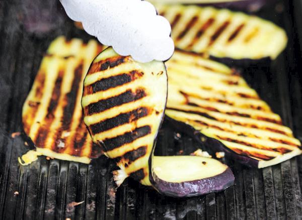 Preheat a griddle pan until very hot, or light a barbecue. Rinse the aubergine pieces in cold water, then pat them really dry with kitchen paper. Mix together the olive oil, garlic, lemon rind and seasoning in a small bowl, then use some to brush all over the aubergine slices. Place on the heated griddle pan or a barbecue with medium-hot coals and cook for two to three minutes on each side, until charred. Set aside and leave to cool a little.