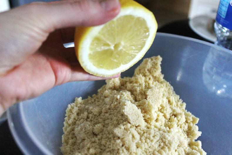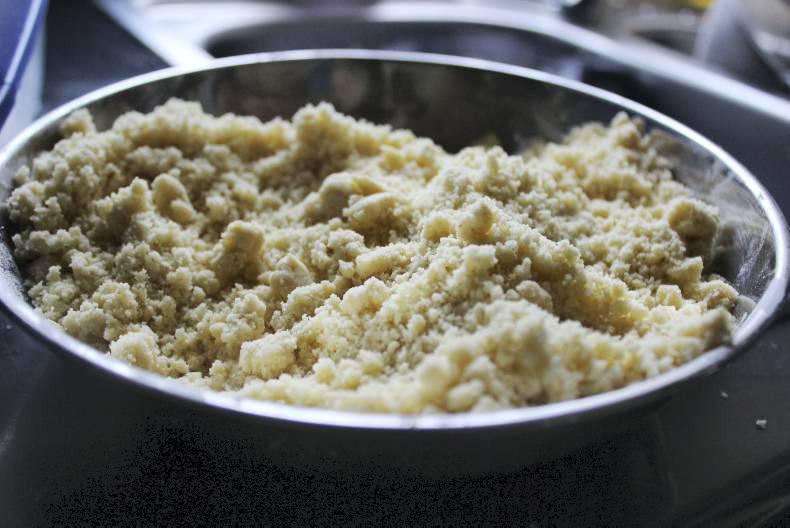 Mix the lemon juice, egg yolk and water together and add to the crumb, a small bit at a time, to bring the dough together. Use a cold fork for this step so to keep temperatures low.