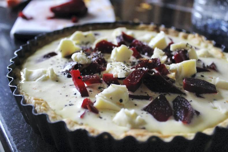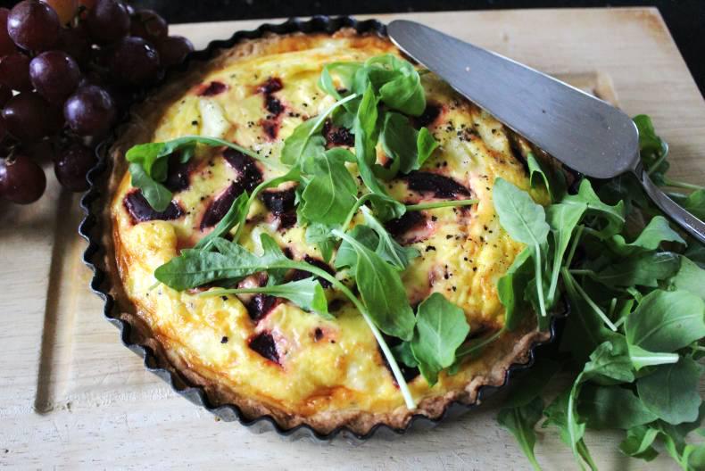 Top with the beetroot, the remaining cheddar and the brie. Bake in the oven for 25 minutes, or until just set. Garnish with rocket and fresh seasoning before serving.