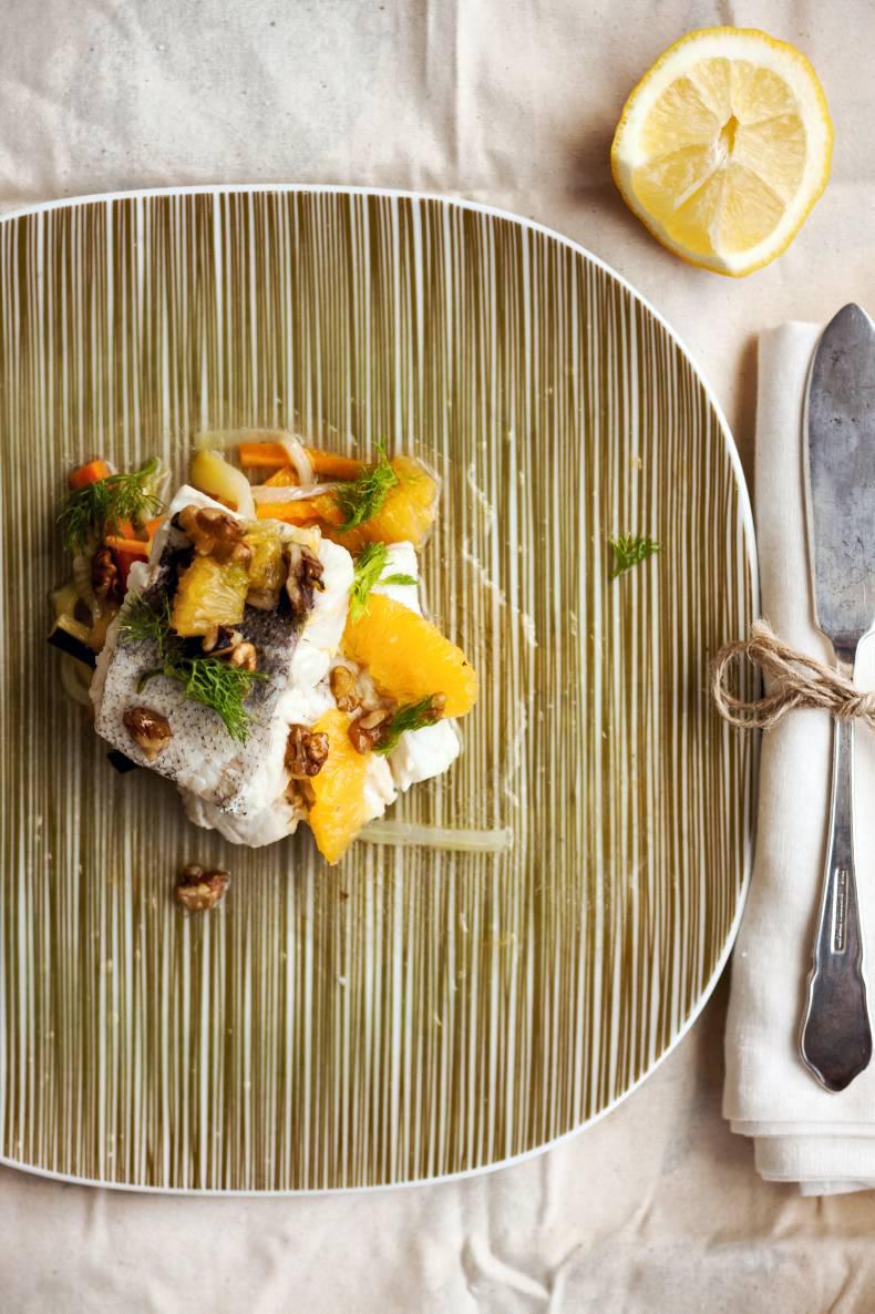 5. Mix the julienne vegetables with the vinaigrette and pop on to a large serving plate, topping with the poached hake – the flavours will speak for themselves!