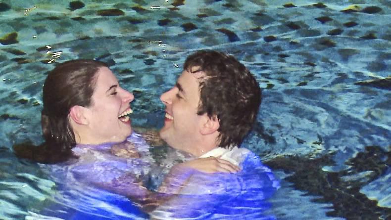 The scene was the swimming pool in Hayfield Manor Hotel in Cork City. We saw Julie walk to the side of the pool on her sticks. She was wearing a figure hugging, snow white dress. She sat on the edge of the steps and slowly let herself into the pool and into David’s arms. They danced beautifully aided by the buoyancy of the water and enjoyed their first dance more than most couples.