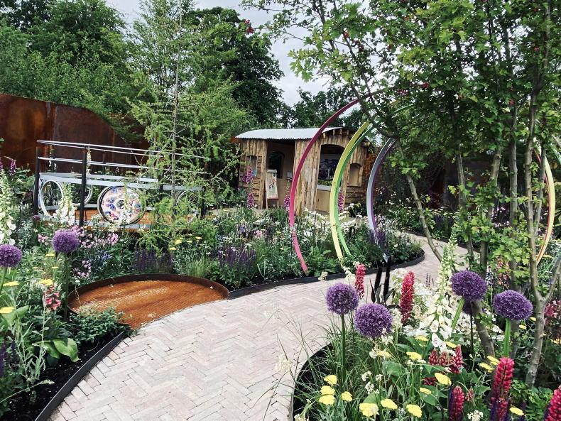 My favourite garden was the Enable Ireland Respite Garden designed by Robert Moore. It was awarded a Silver Medal. It illustrated inclusion and spatial awareness in the garden area. It featured a water feature that was accessible for wheelchair users. It used colourful wheels and paint in an imaginative way. It had lots of flowing grasses and multi coloured plants.