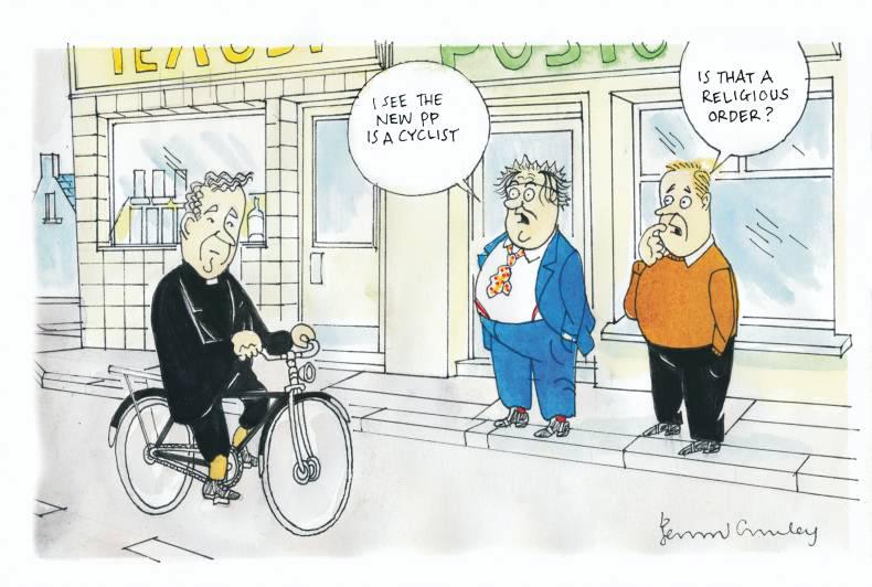 “What if someone is dyin’ over at the back end of Borrisnangoul and they send for the priest to stamp his eternal passport? By the time Fr Pedal arrives on his high nelly, the poor man or woman will be stranded outside the pearly gates with no papers.”