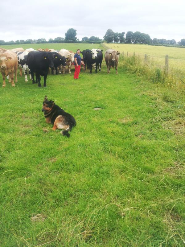 The farm consists of beef, sheep and tillage. Mary keeps 30 suckler cows and finishes the calves at 30 months for beef. They also buy in cattle for fattening. The cows are mainly Limousin and Charolais crosses. They use AI for breeding and breed heifers to Aberdeen Angus bulls, for easy calving.