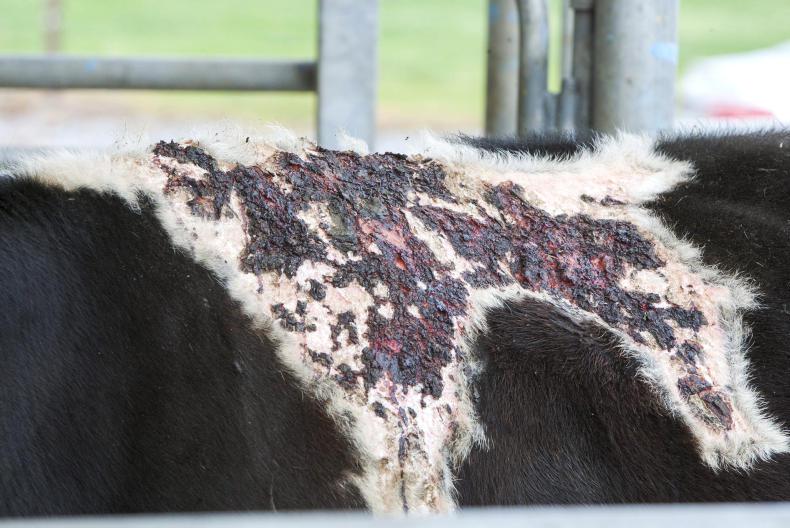 Photosensitisation primarily affects the skin of cows to varying degrees and in some severe cases, the skin can flake and peel away. A photodynamic agent or substance gets to the skin and this reacts with UV light or sunlight, causing the reaction we often see. In my opinion, there has been a notable increase in cases of photosensitisation over the last six to eight years.