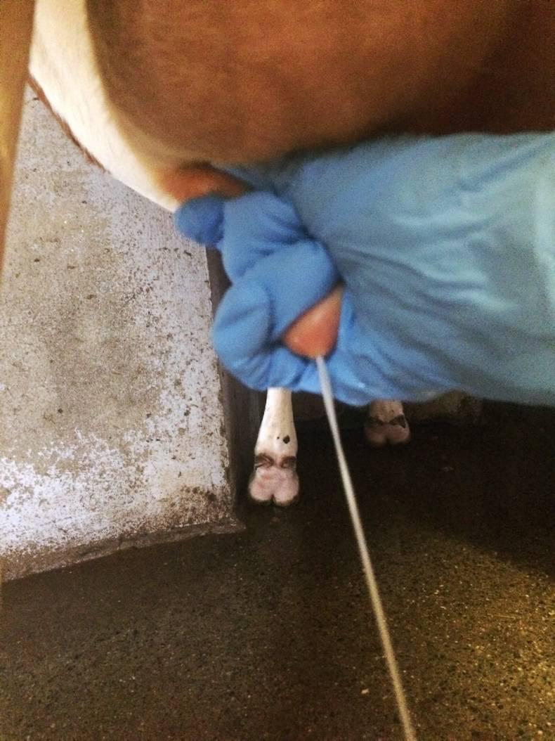 After the teats have been washed and dried, Andrew recommends foremilk stripping in order to identify any clots or milk discolouration. Three squirts of milk on to a clean surface is sufficient to identify any health concerns or any presence of mastitis.