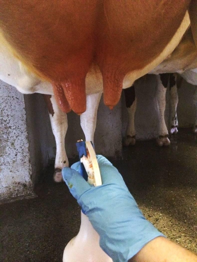 The paper towel should be stained by the teat disinfectant. A ‘‘solid’’ stained area indicates sufficient spray coverage of the teat surface whereas a ‘‘patchy’’, stained area indicates incomplete teat spray coverage.