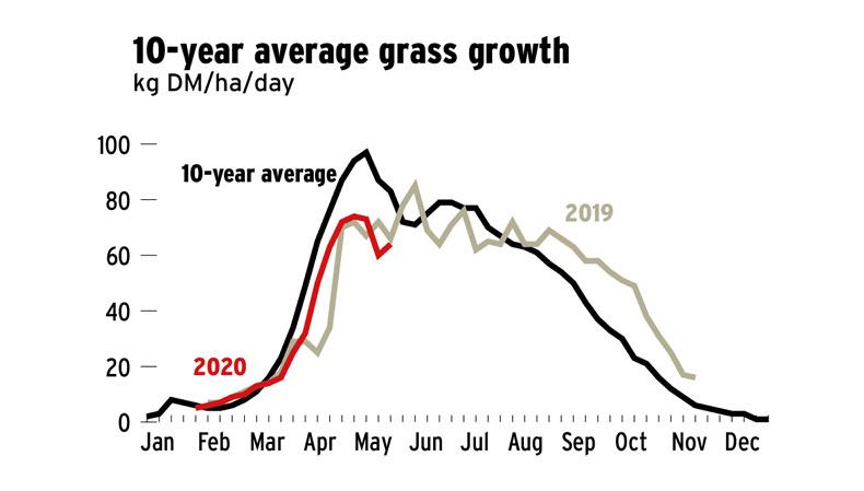 Grass is going well to date. However, the moisture deficit has gone over 45mm for the first time this week which will hit growth. We pre-mowed and grazed a few paddocks that we would normally have taken out, which has also helped the grass situation. Silage was cut here on 15 May so that ground will be available to come back into the rotation to lower the demand if the dry weather persists. The herd here is 230 days in milk, we have fed 1.3t/cow of meal and cows have produced 480kg/MS to date. Our plan is to milk on till the end of July and hope to reach 580kg/MS and keep the meal under 1.5T/cow.