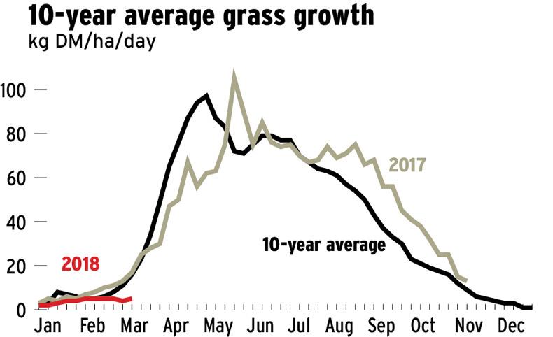 Grass growth is 5kg/day, one-third of the long-term average.Make sure average farm cover does not drop below 500kg/ha.Delay the start of the second round until mid-April to allow time for first grazed paddocks to catch up.