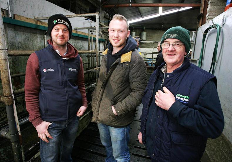 Kieran Donnelly of Provita with Phillip Sleeman (Limavady) and Brian Walsh (Garvagh) during the talk on lameness in cattle, on the farm of Andrew McCollum, Coleraine earlier this year.