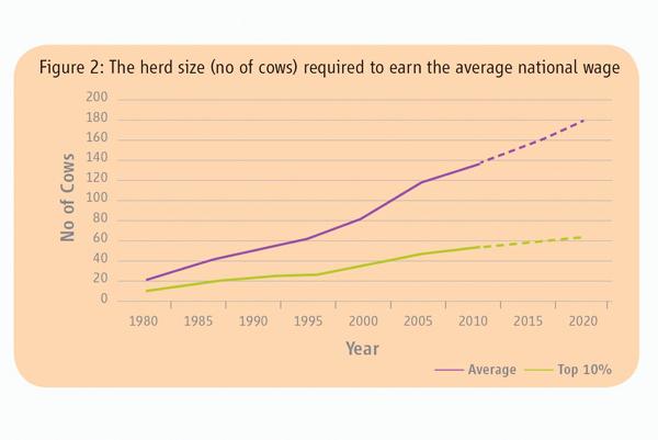 When milk quotas were imposed in Europe, the average herd size in Ireland was 20 cows. At that point, the average dairy farmer needed to be milking 20 cows to earn the then average national wage of £7,800 (Figure 2).