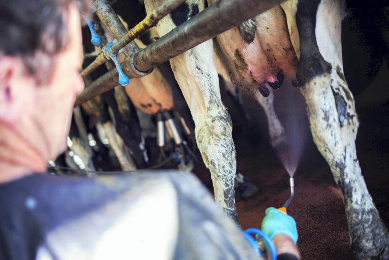 Joe Brown, full-time staff member with Eamonn Fagan, Lough Ree, Glasson, Co Longford, spraying the cows udders during evening milking. \ Ramona Farrelly