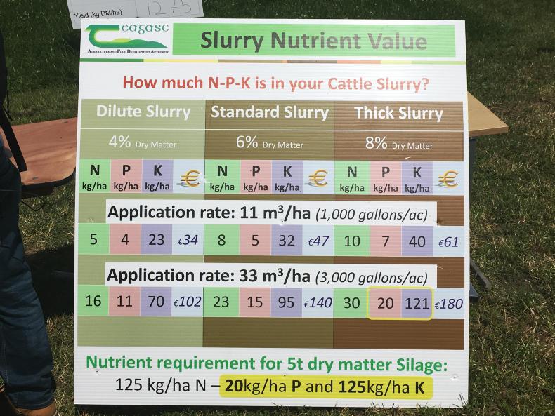 Teagasc adviser William Burchill spoke about how the application of slurry through low-emission slurry spreading equipment – such as the trailing shoe and dribble bar – will increase the fertiliser replacement value of the slurry. Applying 3,000 gallons per acre of cattle slurry by trailing shoe or dribble bar you will get 33kg of available N/ha in the spring compared to 20kg N/ha when applied by splash plate. William also said there is increased flexibility of slurry application with the low-emission slurry spreading with lower contamination of grass. This leads to better utilisation and less souring of the sward.