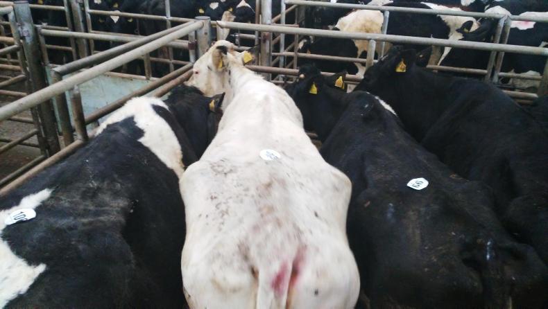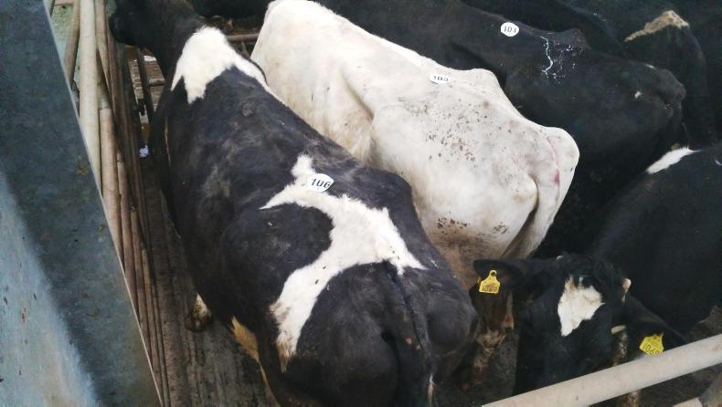 The top price during the Irish Farmers Journal’s visit was for a fat black-and-white cull cow weighing 800kg and she made €1,150 (€1.43/kg). Any cows over 550kg were making in excess of €800.