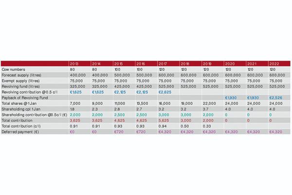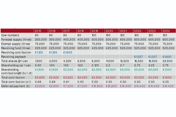 In total terms for this new entrant over the first six years of business, including his initial shareholding cost, he will have invested a total of €14,875 in shares and revolving funds assuming the Dairygold revolving fund finishes in 2017 after five years in existence.