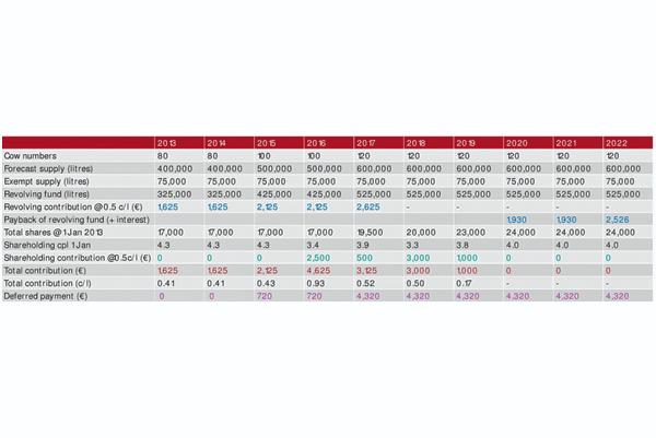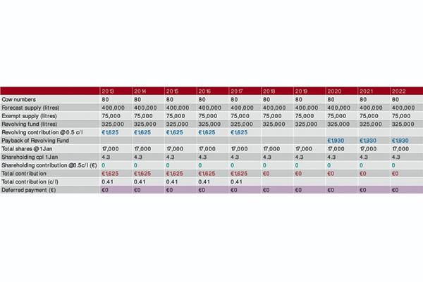 The Dairygold contract requires a minimum of 4,000 shares per 100,000 litres supplied and all suppliers must contribute to the revolving fund to help fund new investment. A deferred payment equal to 20% of the milk price on the volume increase over your base line supply (2010-2012) will be taken from milk cheques from May to September and returned the following March to fund extra working capital for the co-op.