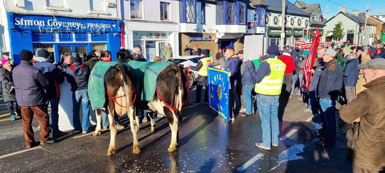 The Irish Farmers' Association (IFA) protest began with a march down the main street of Carrigaline, where the farmers stopped outside the office of Minister for Enterprise Simon Coveney.