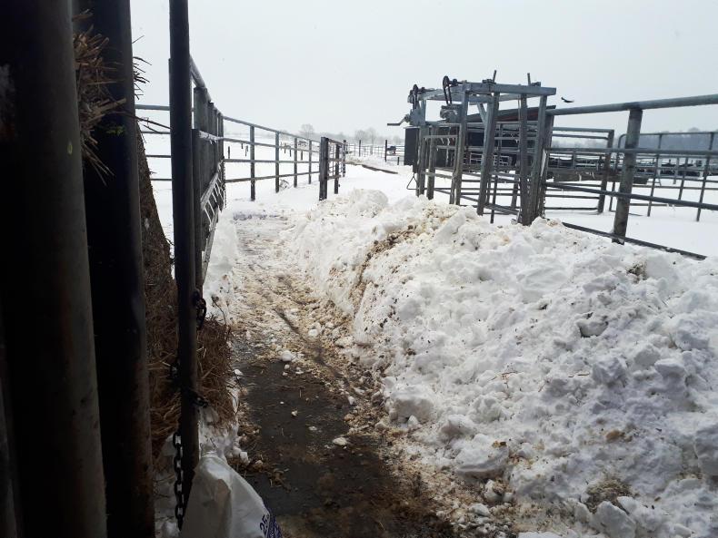 The cows hadn't been milked since Thursday morning as the farm battled with sweeping snow drifts that effectively swamped the farm and farmyard in a blanket of snow, with drifts of over 1m on all yards, cubicles and approach roads.