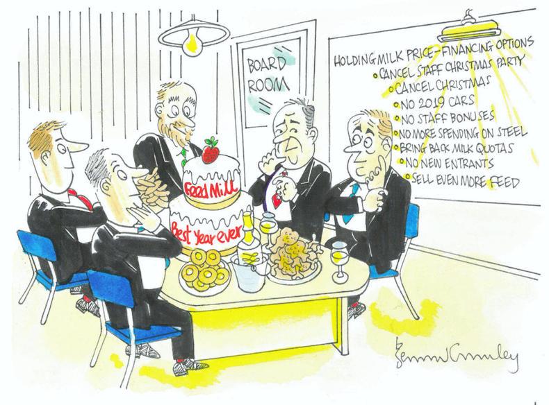 Milk league cartoon for October 2018 showed an office celebration with executives celebrating the large volumes of feed sold in 2018 and a list of options for holding milk price.
