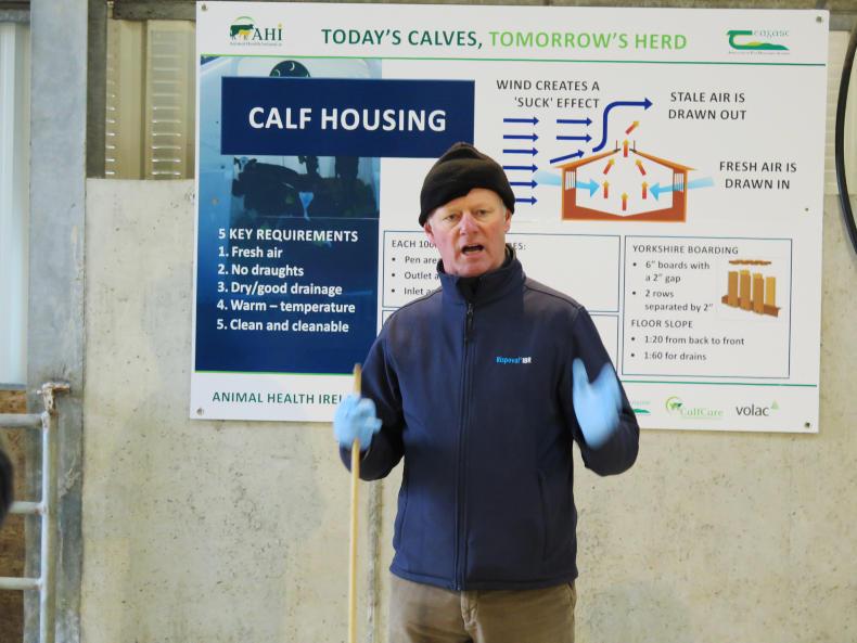 Two vets, Charles Chavasse and Kieran O’Mahony, both said that prevention starts with disinfection. Charles said the best disinfection is fresh air, as it is free and in abundant supply. He spoke about the design of calf sheds. Fresh air is needed to remove stale air.