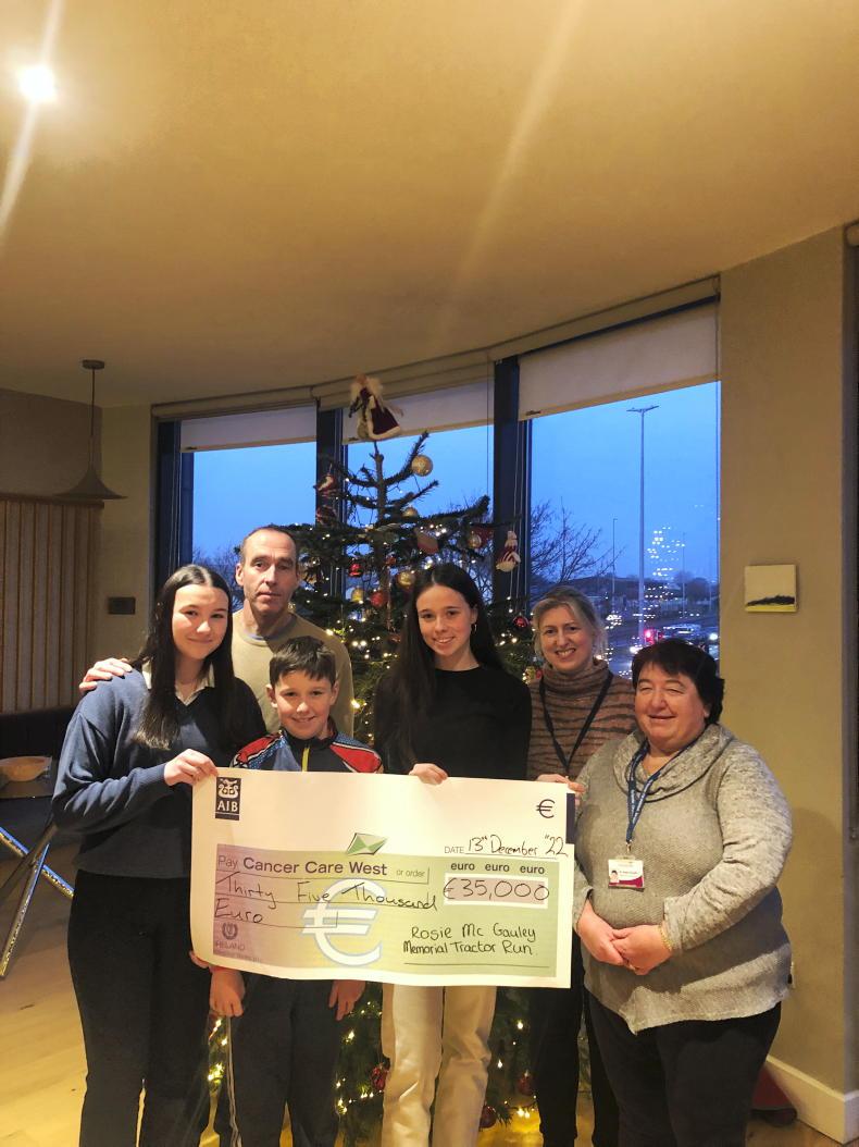 The community of Oughterard, Co Galway have raised €35,000 for Cancer Care West in memory of Rosie McGauley, a young wife and mother who passed away from cancer eight years ago.