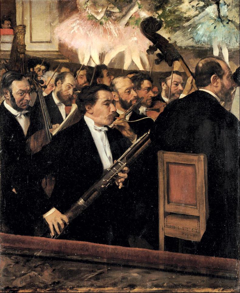 Paying homage to his friend Désiré Dihau, the bassoonist in the foreground, Degas chose an unusual frame in which to set his painting. He had the dancers on stage – less their heads – while in the theatre box is the composer Emmanuel Chabrier. The focus is very much on the orchestra.