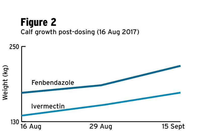 Two products were tested, ivermectin- (IV) and fenbendazole-based (FB). Calves were split into two for dosing, such that gender and faecal egg counts were similar for both groups.