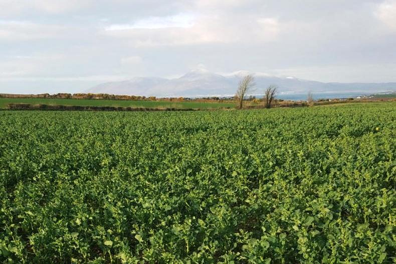 Iain McMordie’s Exstar hybrid winter oilseed rape with a snow-caped Mourne Mountains in the distance.