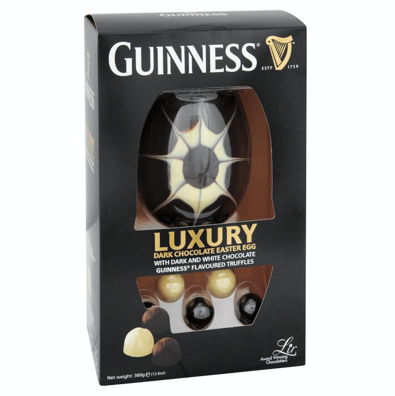 egg with truffles With dark chocolate, white chocolate and Guinness truffles, that is an egg that would impress any lover of the black stuff. The luscious chocolate ganache is flavoured with the classic taste of Guinness and set in a creamy white chocolate shell. Best of all, this unique egg is made at Lir Chocolates in Navan, Co Meath.