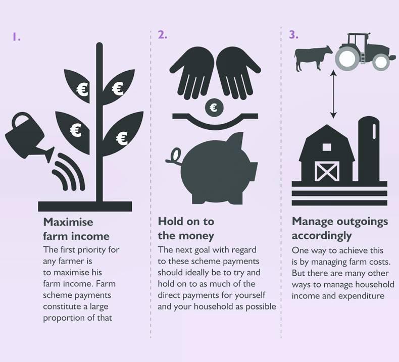 • How much do you need to run the household on a monthly basis?• Could you reduce non-productive farm costs?• Farm costs/insurance/utilities – spread your bills over the course of the year, switch providers, bundle or save by paying online (switch and save).• Reduce energy costs – avail of recently increased SEAI grants.• Bundle your debt – shop around for best rates. Meet with bank/financial institution.• Smart use of resources – use your resources effectively and efficiently, tapping into as many as possible to make your finances flourish.By minding your money and getting the best from it you will also mind yourself, giving you a sense of control and consequently more peace of mind.