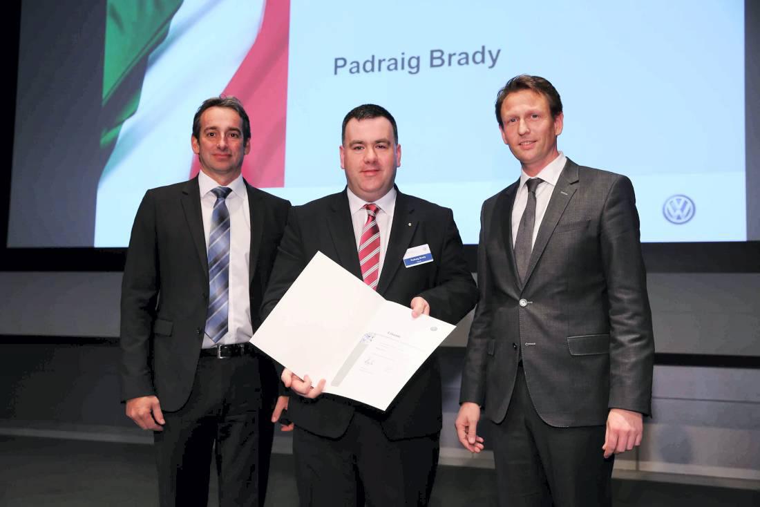 Pictured at the Volkswagen Diamond Pin Awards, which took place in Berlin, Germany, is Dr. Wolf-Stefan Specht, head of Volkswagen passenger cars; Padraig Brady, managing director of Brady’s Arva and Gerrit Heimberg, regional manager, sales europe at Volkswagen AG.