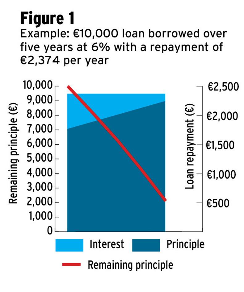 Most loans are structured so that the initial amount borrowed is paid back in instalments over a certain period. Each of these loan repayments is made up of two components – the capital portion and the interest portion. A feature of setting the repayments is that they stay more or less constant during the repayment period but the capital and interest components change as the loan is gradually repaid.