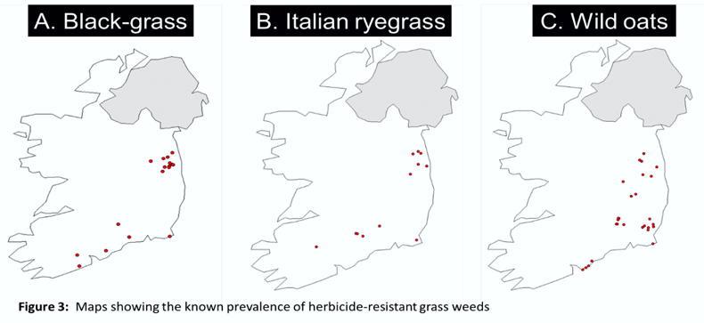 19 out of 34 farms (56%) with black-grass were ACCase (eg Falcon and Stratos Ultra) and/or ALS (eg Pacifica)-resistant (Figure 3A). 12 out of 20 farms (60%) with Italian ryegrass were ACCase (eg Axial, Falcon or Stratos Ultra) and/or ALS (eg Pacifica, Broadway)-resistant (Figure 3B).28 out of 150 farms (19%) with wild oats were ACCase (eg Axial, Falcon or Stratos Ultra)-resistant only (Figure 3C).
