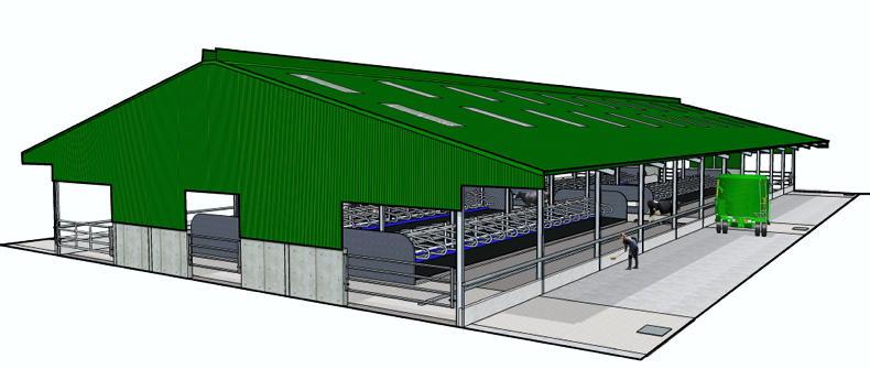Space/cow (inside feed barrier) 8.3m2.Feed space/cow 0.78m.Slurry storage/cow 7.24m3.Advantages versus and internal centre (single) feed passage