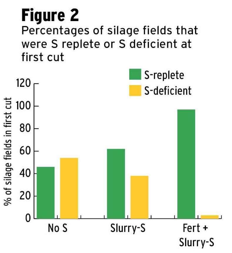 Previous research suggests that although animal manures contain considerable amounts of S, it is largely unavailable for crop uptake in either short or longer terms. The results of the present survey uphold this conclusion. As shown in Figure 2, 54% of swards receiving no slurry or fertiliser S at first cut were S-deficient.