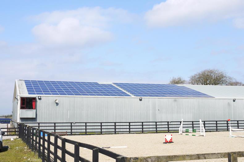 PV panels on the roof of the indoor arena in Gurteen College produce 50 kW of electricity.PV panels on the roof of the indoor arena in Gurteen College produce 50 kW of electricity.