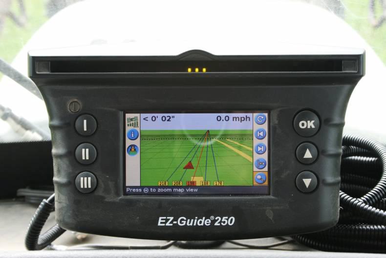 The EZ-Guide 250 which Aidan purchased is an entry level GPS system equipped with a light bar and 11cm screen. He mounted it on the dash of his Steyr 9105 (CaseIH CS110) where he could easily see both the screen and light bar, plus enter or change settings as required.