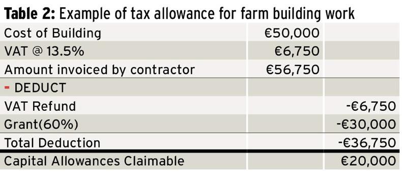 The annual tax allowance is calculated as a percentage of the gross cost minus VAT refundable and the grant. Table 2 shows an example of tax allowances claimable for a €50,000 building project.