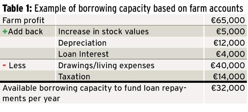 Once the cost of the development has been established (including contingency), the next step is securing funding. Most farm investments are funded out of either existing funds (savings) or loans and often a combination of both. If a farmer is planning to borrow the money, there will be a period between paying for the development and receiving grant and VAT 58 refund. If borrowing from a bank, this portion of the loan is called “bridging”. The remainder of the investment should then go on a term loan. The two main banks are currently offering loans for capital investments at about 4.5% to 5% interest. While the bank will calculate a repayment capacity when a farmer applies for a loan, the individual farmer should also calculate their own borrowing capacity. Borrowing capacity varies across every individual farm. In essence, borrowing capacity is established by calculating the cash funds available to pay a loan after farm has discounted the cost of living, tax and other capital investments in a given year from the farm profit. Table 1 outlines the borrowing capacity of a farm with a farm profit of €65,000.