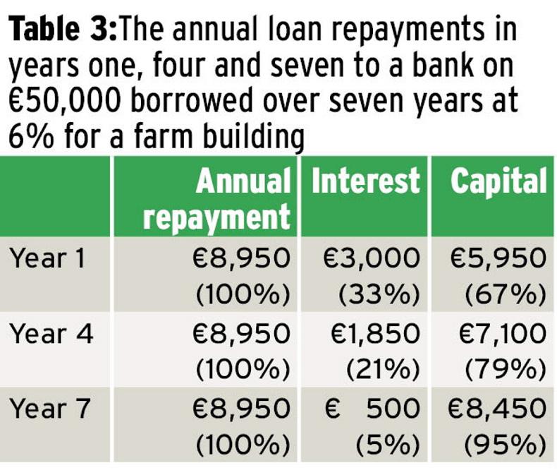 The profits shown on a farm profit and loss account only shows bank interest payable but not the capital repayment element of loan repayments. The capital repayment element has to be funded from after tax income. Table 3 outlines the annual loan repayments in years one, four and seven to a bank on €50,000 borrowed over seven years at 6%.