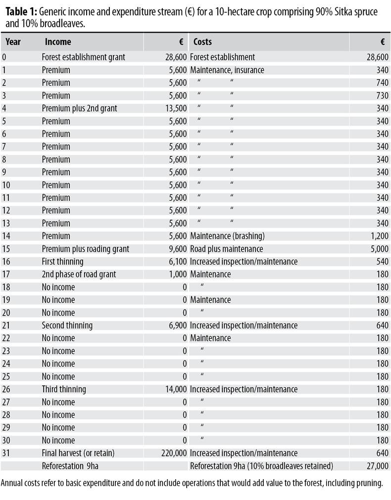 “We have forestry land on our books throughout Ireland, unsuitable for agriculture but capable of producing high yielding forests, which is selling for up to €5,000 an acre (€12,000/ha),” he said. “Banks look favourably on loan applications for forestry due to the 100% grant for establishing a forest and the 15-year tax-free premiums which will bring the forest to the production phase,” according to Paddy Bruton. The continuous income stream from forestry (Table 1) is a deciding factor in banks providing loans. “Forestry is now a liquid asset which is easier to trade and both private investors and farmers see it as a safe, solid and secure investment.”