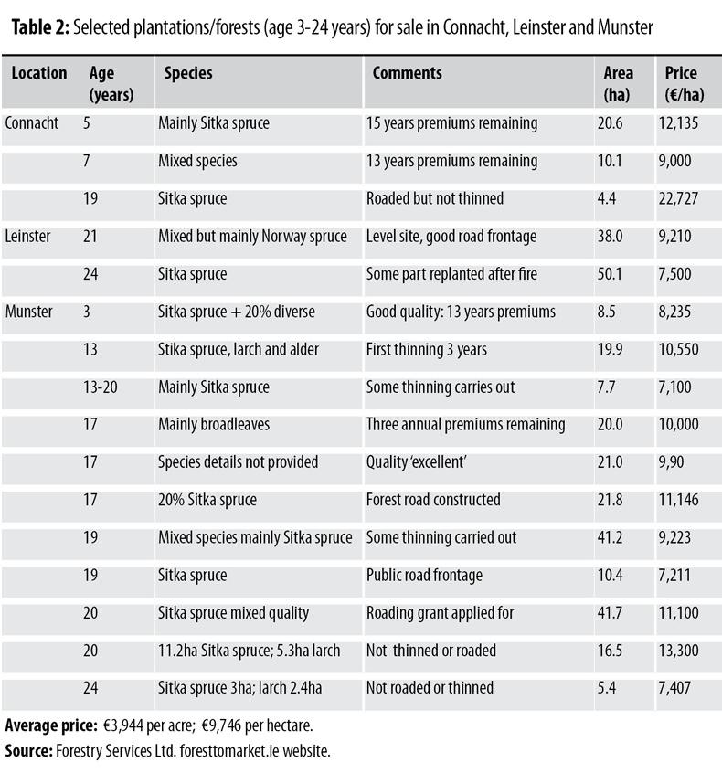 In 2016, FSL launched the website foresttomarket.ie, which is a dedicated platform for investors to source existing forests and land suitable for forestry for sale by auctioneers in Ireland. The small cross section of sites (Table 2) provides a snapshot of expected prices for lots in Connaught, Leinster and Munster.