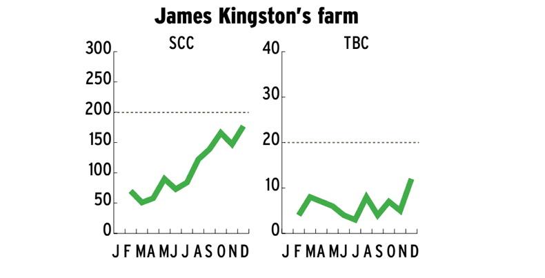James is big on simplifying the system and is a great believer in milk-recording as a tool to monitor yield and cell count. He has been recording for the last 11 years and uses the results to compare cows on yield and SCC.