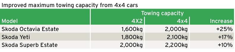 Here we look at the towing rating differences of three cars in the Skoda range to highlight the additional advantages in the towing capacity by adding the extra drive system. The 2,200kg towing rating for the Skoda Superb is equivalent to the capacity to tow a double horsebox with two horses on board.