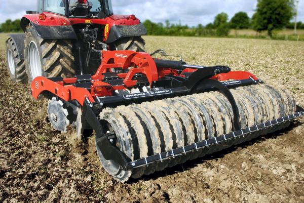 A double row of hydraulically controlled discs chop, cultivate and mix trash residue to create a level tilth. A rear packer then consolidates the ground, leaving a level seedbed.