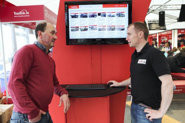 Padraig Foley, Farmers Journal Toplink explains the switch to Toplink to David Jennings, Killeagh, Co. Cork on the Irish Farmers Stand at the Ploughing at Ratheniska. PIC: DOL